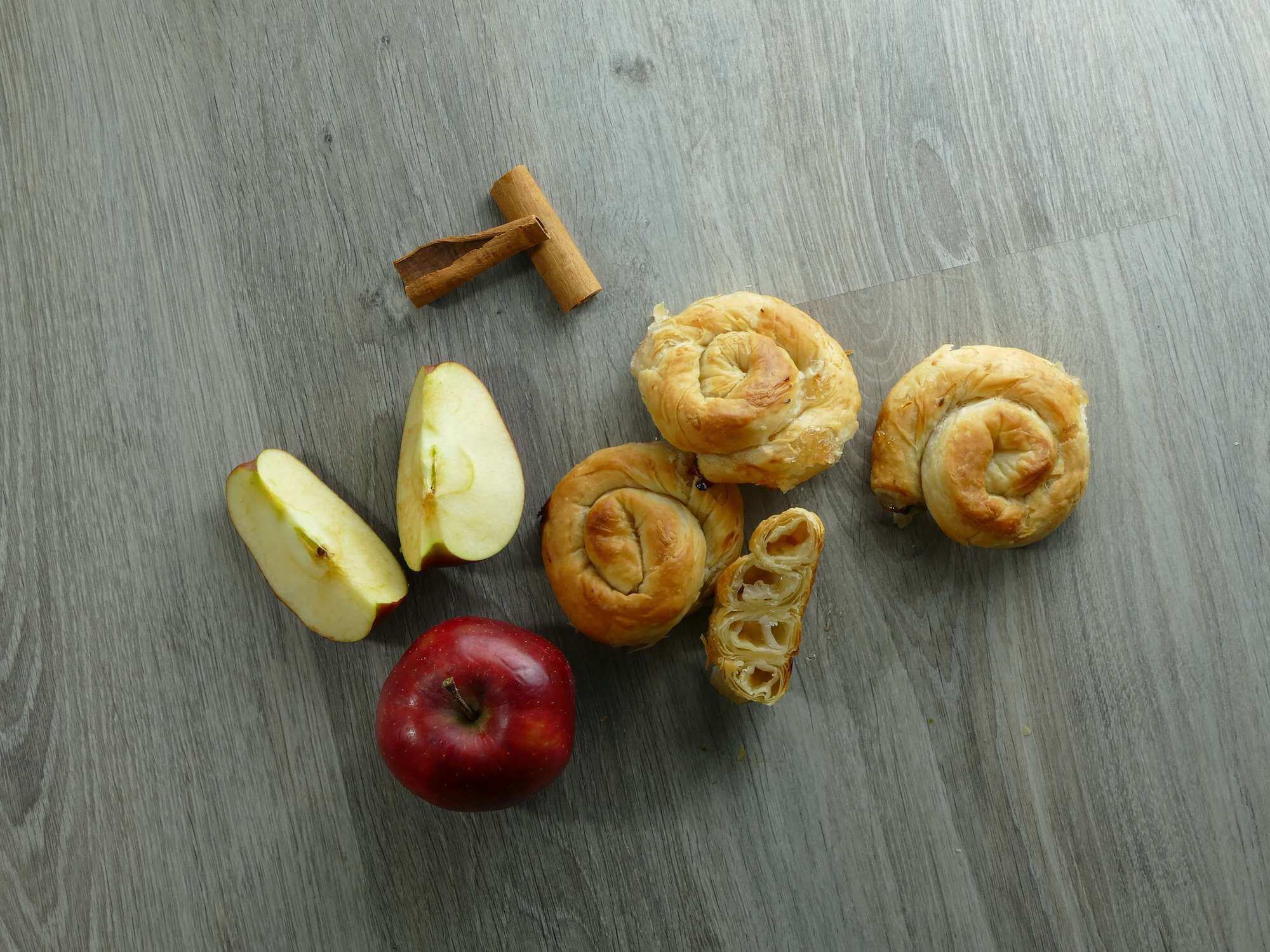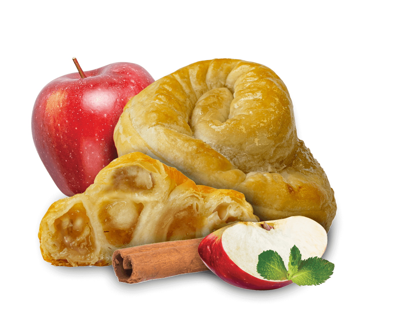 Almás töltelék 50% (alma 50%, cukor, víz, sűrítőanyag: módosított kukoricakeményítő, savanyúságot szabályozó anyag: citromsav); búzafinomliszt, víz, növényi olaj (napraforgó, pálma), étkezési só, fahéj, állományjavító: L- cisztein